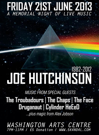 A memorial night of live music has been arranged by Joe's friends with many of them performing in tribute to him. Live acts include The Troubadours, The Chaps, The Face, Druganaut & Cylinder HeEed. This will be a great opportunity to meet and remember Joe, share stories and have a good time in his memory.